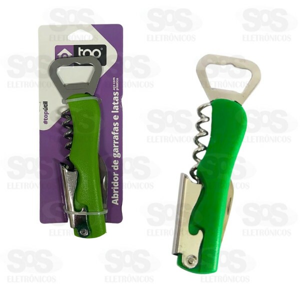 Multi-funções, ele é abridor de garrafas, saca-rolhas e abridor de latas.