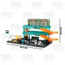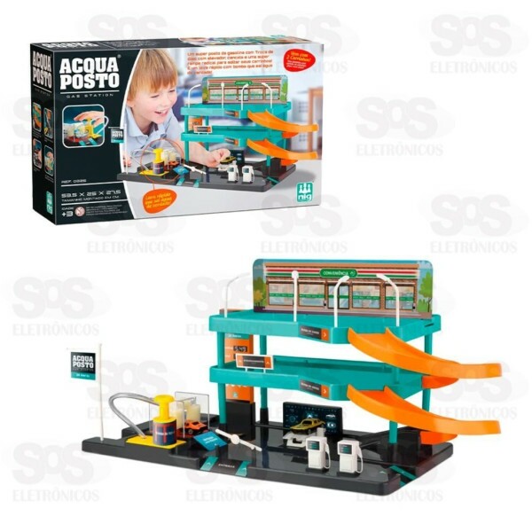 Um super posto de gasolina com lava rápido, bomba de gasolina, troca de óleo com elevador, cancela para controlar o trânsito e rampas para soltar os carrinhos.