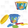1 baldinho, 1 peneirinha, 1 pá, 1 rastel, 1 fôrma concha, 1 fôrma caranguejo.