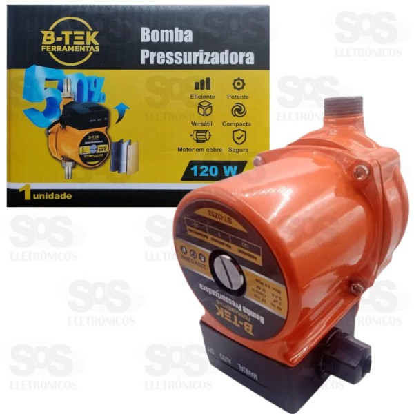 Bomba Pressurizadora de Água 120W – 127V | Silenciosa e EficienteCompacta, econômica e de fácil instalação, ela foi projetada para aumentar a vazão e proporcionar um fluxo de água muito mais forte e confortável em ambientes residenciais.BenefíciosAumenta a pressão da água em chuveiros, torneiras e aquecedores.Motor potente e silencioso de 120W.Design compacto, ideal para residências e pequenos estabelecimentos.Instalação prática, podendo ser utilizada em diferentes pontos de água.Construção robusta, garantindo maior durabilidade e segurança.Proporciona mais conforto no banho e uso diário.Especificações TécnicasPotência: 120WTensão: 127VFrequência: 60HzPressão máxima: 0,6 MPa (6 bar)Vazão máxima: 25 L/minAltura manométrica máxima: 9 mTipo: Automática (liga/desliga conforme fluxo de água)Indicações de UsoChuveiros e duchas com pouca pressão.Torneiras de cozinha e banheiro.Aquecedores de passagem.Sistemas residenciais com caixa d’água.Com esta bomba pressurizadora, você garante mais conforto, eficiência e praticidade no seu dia a dia, eliminando de vez o problema da água fraca.