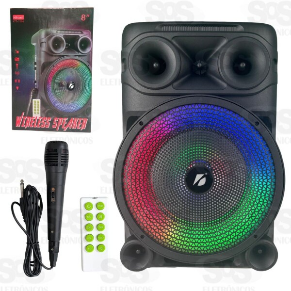 Itens inclusos: 1x Caixa de som, 1x Cabo USB, 1x Microfone com fio, 1x Controle remoto