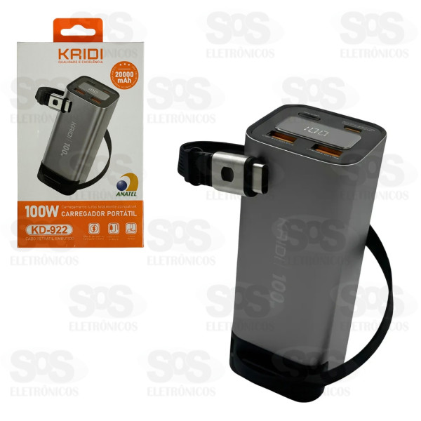 Carga Extra 20.000mAh Cabo Type C Retrátil Kaidi KD-922
