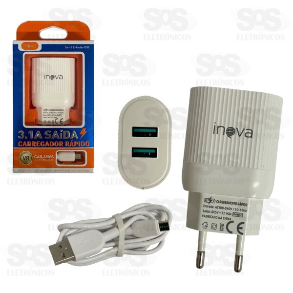 Carregador 2 USB 3.1A Cabo Micro V8 Inova CAR-3296S