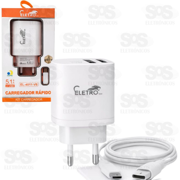 Carregador 2 USB 5.1A Com Cabo Micro V8 Eletromex EL-4011-V8Carregador rápido e estável, carregue os aparelhos eletrônicos com segurança e velocidade.Conta com 2 entradas USB.Cabo micro usb V8 de 1 metro.Material de alta qualidade muito resistente.Cores variadas