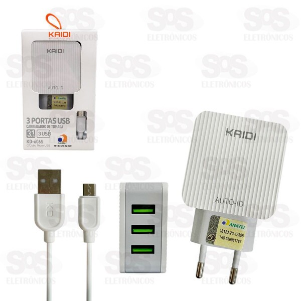 Carregador 3 USB 3.1A Com Cabo Micro USB V8 Kaidi KD-606S