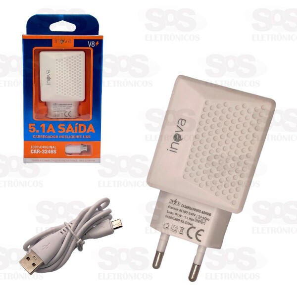 Carregador 3 USB 5.1A Com Cabo Micro V8 Inova CAR-3246S Carregador rápido e inteligente, carregue seus aparelhos com entrada Micro V8 com segurança e velocidade. Proteção contra sobrecarga e chip inteligente. - Conta com 3 entradas USB - Cabo Micro USB V8 de 1 metro - Medidas: 9 x 4,5 cm