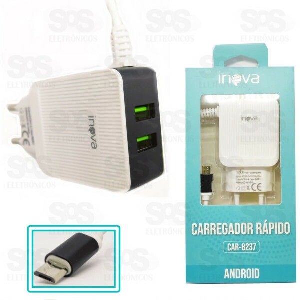 Carregador de parede, carregador inclui um cabo de 1,20 metros micro usb V8 e duas saídas usb podendo carregar 3 aparelhos simultaneamente.