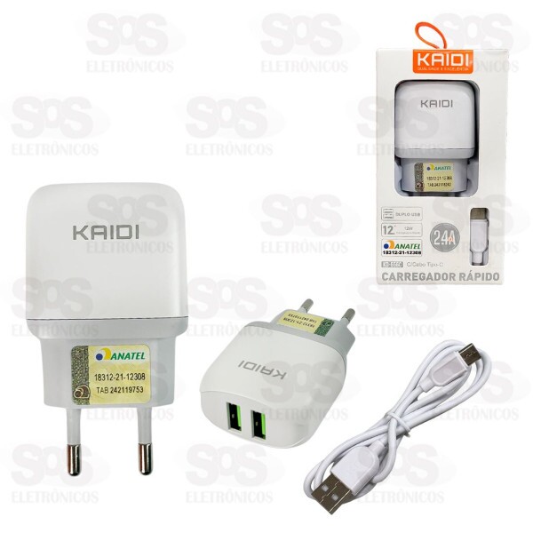 Carregador Rápido 2 USB 2.4A Cabo Type-C Kaidi KD-556C