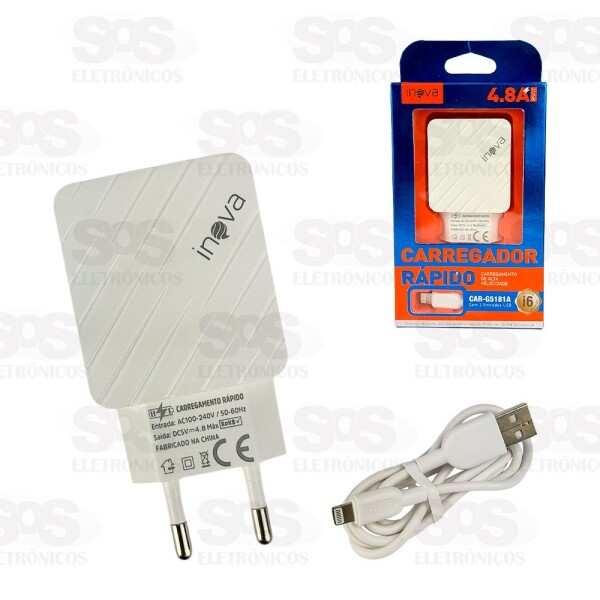 Carregador Rápido 2 USB 4.8A Cabo Iphone Inova CAR-G5181A Carregador rápido e inteligente, carregue seu iphone com segurança e velocidade. - Chip inteligente - Alta eficiência - Proteção contra sobrecarga - 2 entradas USB de alta potência - Cabo de Iphone de 1 metro. Entrada: AC100-240V / 50-60Hz Saida: DC5V --- 4.8 Máx Cores variadas