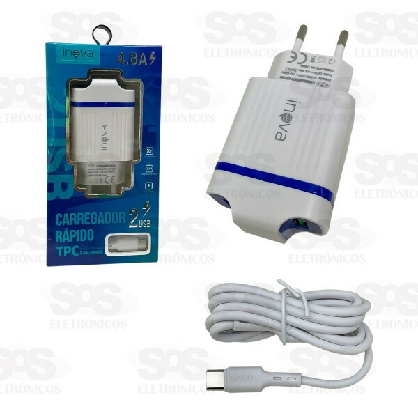 Carregador Rápido 4.8A 2 USB Cabo Type-C Inova CAR-9006 Carregador rápido e inteligente, carrega seu smartphone, tablet, gps, psp, câmera e outros aparelhos com segurança e velocidade. Chip inteligente e carga rápida. Conta com 2 entradas USB. Cabo TYPE-C de 1 metro. - Entrada: AC100-240V / 50-60Hz - Saída: DC5V - 4.8 MÁX RoHS