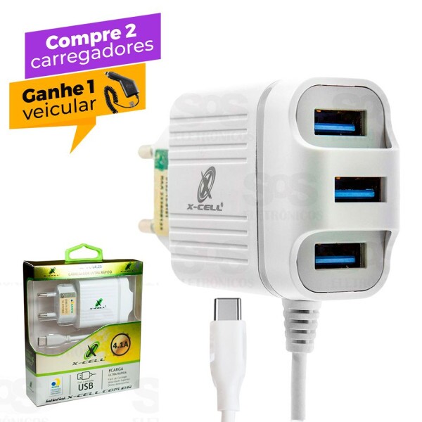 Carregador de parede ultra rápido com conector Type C e 3 entradas USB.