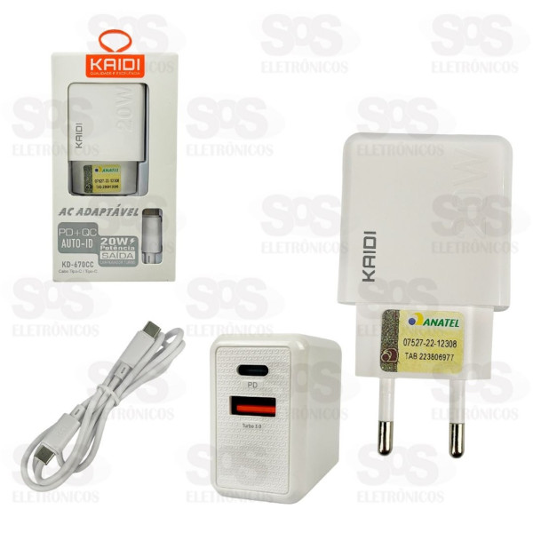 Carregador USB 3.0 + PD 20W Com Cabo Type C Kaidi KD-670CC