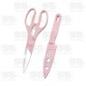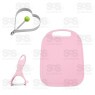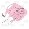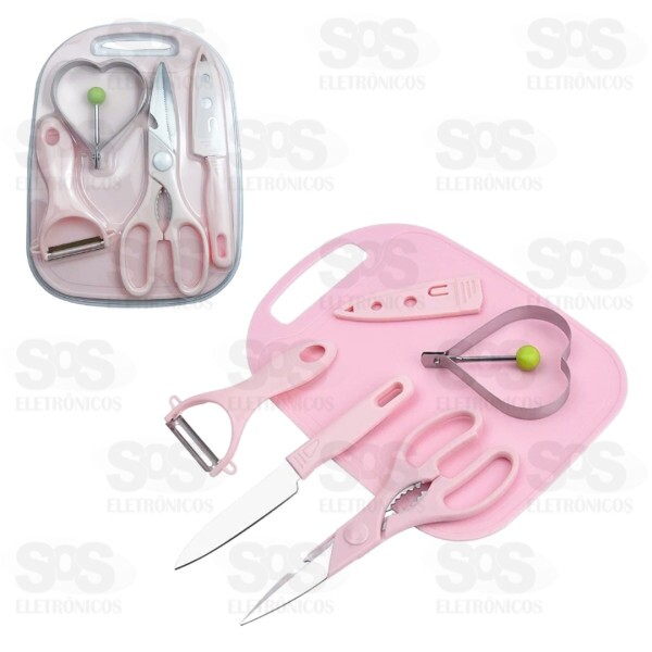 Conjunto com uma faca de fruta, um descascador, uma tesoura, uma tábua e um molde para ovo.