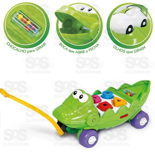O Jacaré Didático é um brinquedo cheio de detalhes e com itens super inteligentes para despertar a curiosidade, entreter e acompanhar seu filho para todo lugar. Feito em material resistente, detalhes que chamam a atenção da criançada: Olhos que giram Boca que abre e fecha quando o jacaré sai do lugar. Experimente puxá-lo pelo puxador frontal Suas rodas podem ser travadas para a brincadeira ficar mais concentrada Chocalho com barulhinho a cada giro; E mais! O kit didático com formas e cores para encaixe existente no jacaré didático pode ser removido para brincadeira individual ou para dar lugar a outros itens para transporte! Desenvolve a coordenação motora Estimula a concentração Amplia a capacidade de percepção Desenvolve a interação com o meio Ideal para atividades individuais ou em grupo Amplia a percepção espacial