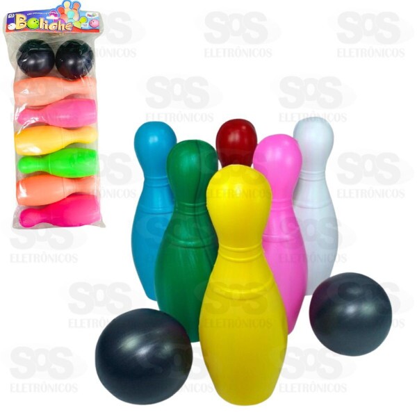 Mini boliche de plástico com 6 pinos e 2 bolas.