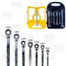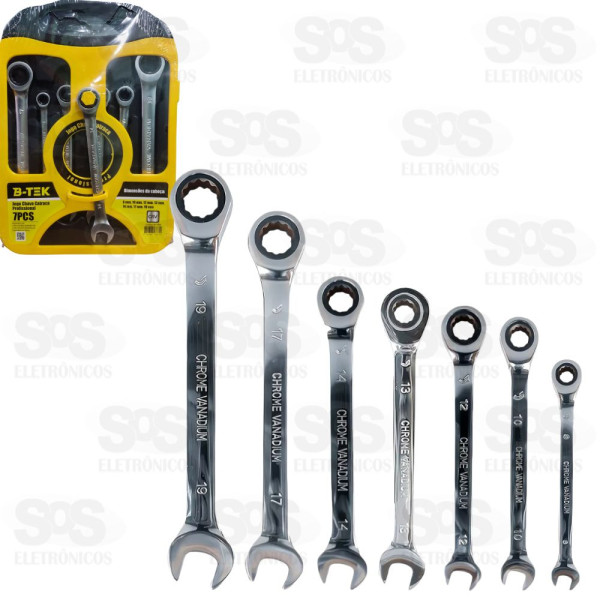 Jogo de chaves combinadas com catraca, composto por uma caixa plástica contendo 7 chaves para apertar e afrouxar porcas e parafusos. Tamanhos: 8 mm, 10 mm, 12 mm, 13 mm, 14 mm, 17 mm, 19 mm Material do corpo da chave: aço cromo vanádio Acabamento da chave: cromado fosco O corpo da chave é forjado com precisão em aço cromo-vanádio com uma superfície polida cromada fosca para excelente resistência à oxidação/corrosão e está disponível em diferentes tamanhos para uso em diferentes cenários de trabalho. Tratamento de têmpera geral, alta dureza, mais durável.
