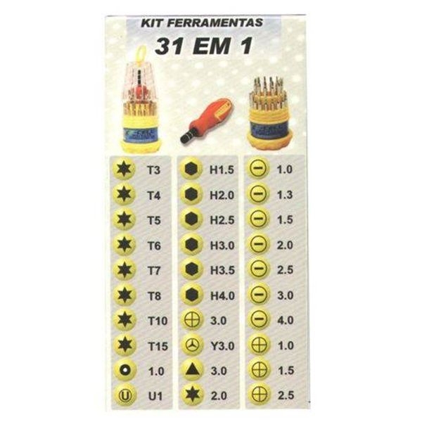Economize com o conserto do seu celular e equipamento eletrônico com o jogo de 31 peças de precisão que possibilita realizar quaisquer reparos domésticos, automotivos, eletrônicos e, além disso, acompanha chaves para abrir celulares , permitindo uma manutenção precisa e segura.Possui um empunhadura que facilita os apertos e as opções de pontas vão de Allen, Torx, Philips à chaves de fenda.Desenvolvido com material de qualidade, oferece resistência, durabilidade e uma grande variedade de chaves para qualquer situação.