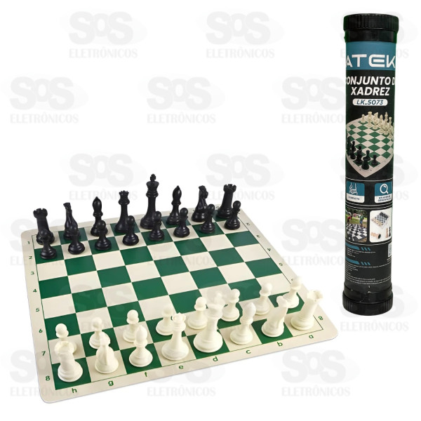 Jogo de xadrez com tabuleiro em PVC dobrável.