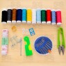 Acompanha 10 linhas coloridas e 16 agulhas, além de contar com 5 botões de metal, 4 botões de plástico, 10 alfinetes, 1 suporte, 1 suporte para linha, 1 cortador e 1 fita métrica.