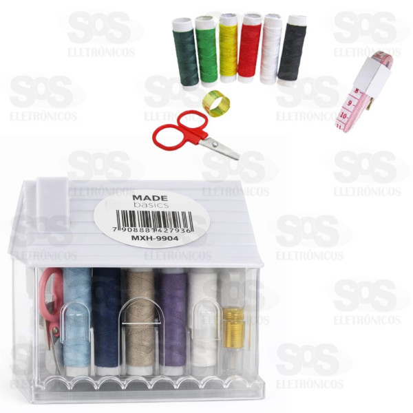 Acompanha 10 linhas coloridas e agulhas, além de contar com fita métrica, tesourinha, passador de linha, e botões.