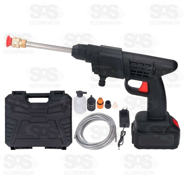 Acompanha mangueira de 5 metros, um dispenser para sabão, um filtro, engate rápido para mangueira, uma bateria, um carregador e uma maleta para armazenamento.