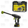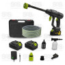 Acompanha mangueira de 5 metros, um dispenser para sabão, um filtro, engate rápido para mangueira, duas baterias, um carregador e uma maleta para armazenamento.