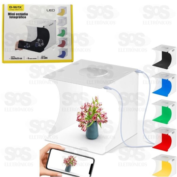 2 barras de luz, 6 panos de fundo, 1 cabo USB, 1 bolsa de pano.