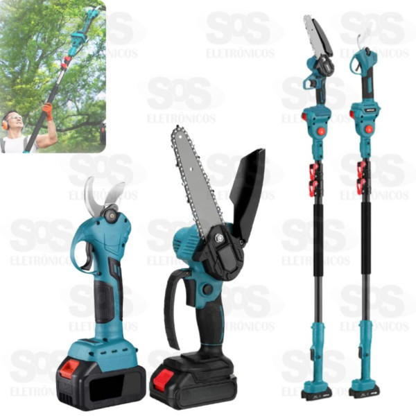 Kit Motosserra, Tesoura Elétrica e Prolongador Telescópico – Jardim Profissional a Bateria