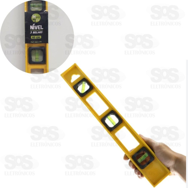 Nível Com 3 Bolhas 40CM Ideal para verificar se um plano está nivelado, seja em horizontal ou na vertical.Possui um corpo em plástico resistente.Acompanhado de 3 bolhas para nivelamento.Tamanho: 40 cm (16 polegadas)