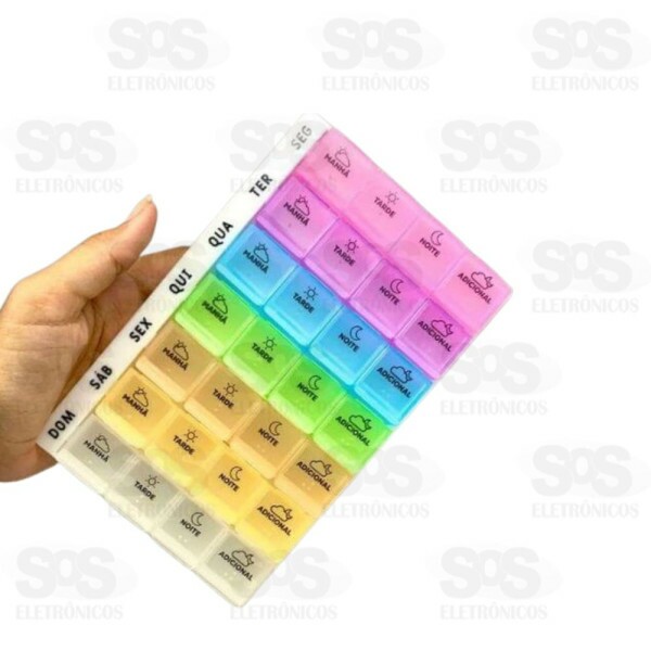 Porta medicamentos com 4 compartimentos diários (Manhã, Tarde, Noite e Adicional) para os 7 dias da semana. Indispensável para quem faz uso contínuo de remédios. Muito útil, prático e organizado. Os compartimentos são independentes, encaixados em uma bandeja, facilitando assim o transporte dos remédios do dia. Total de 28 compartimentos. Material: Plástico. Dimensões aproximadas considerando a base (bandeja organizadora): 18x11x2,5cm Medidas externas (fileira com 4 compartimentos): 10,1cm x 2cm x 2,3cm (largura x altura x profundidade). Medidas internas (cada cavidade/compartimento): 2,5cm x 2cm x 2,1cm (largura x altura x profundidade). A bandeja organizadora (base) é sem fixação para acoplar os compartimentos. (Compartimentos ficam em cima da bandeja sem mecanismo de fixação à mesma, assim sendo, soltos. )