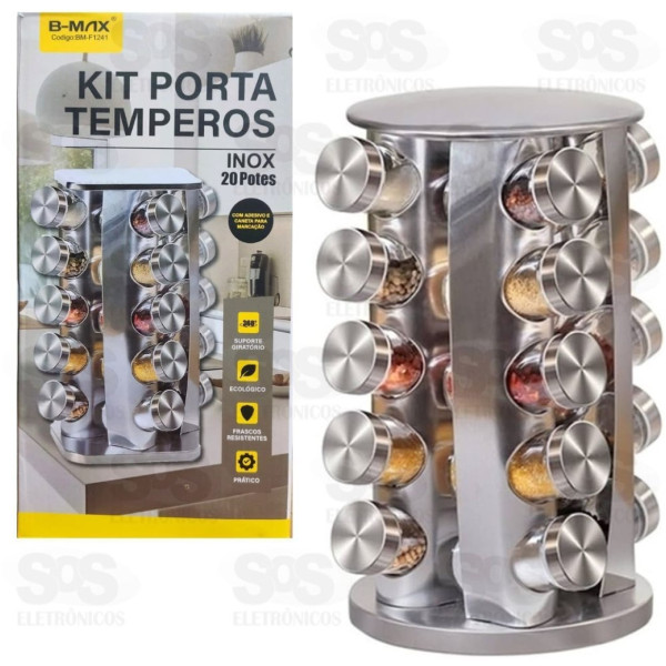 Porta Temperos 20 Potes Giratorio Redondo Inox e Vidro B-Max BM-F1241