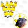 Cada patinho possui um enfeite colorido exclusivo, preso à presilha por uma mola que dá movimento ao patinho.