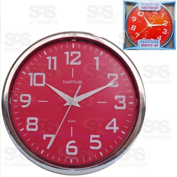 Relógio de parede redondo com números metalizado cromado.