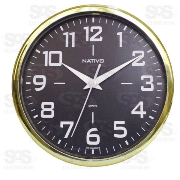 Sua borda é em polipropileno na cor dourada e o fundo do relógio em azul.